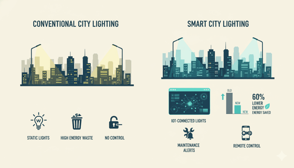| Streetlight Control | Timed manually | Remote + adaptive | 25–45% savings |